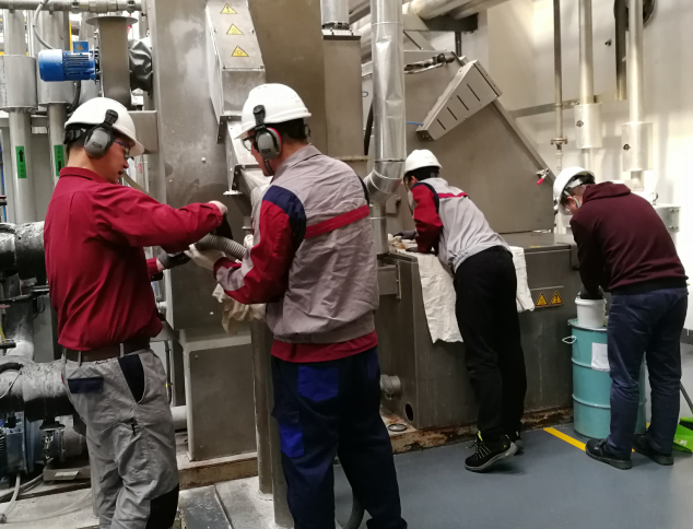 安全培訓完成之后,發(fā)放PPE,大家邁著矯健的步伐開赴生產現場,離心甩干機旁。各個小組正在集合各自組員。