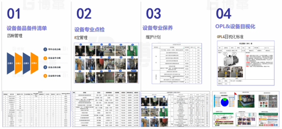 第三步建立健全設(shè)備專業(yè)維護(hù)標(biāo)準(zhǔn),將設(shè)備專業(yè)維護(hù)分為專業(yè)點(diǎn)檢、專業(yè)保養(yǎng)、備品備件管理、設(shè)備目視化與知識(shí)教導(dǎo)OPL。通過設(shè)備專業(yè)維護(hù)導(dǎo)入,對(duì)于之前模糊的遺漏的維護(hù)點(diǎn)位有了清晰的認(rèn)識(shí),讓專業(yè)維護(hù)人員對(duì)什么時(shí)候要做什么有了充分的了解和準(zhǔn)備。推動(dòng)設(shè)備定期專業(yè)維護(hù),形成每周進(jìn)行一次專業(yè)維護(hù),并逐步優(yōu)化每周專業(yè)維護(hù)的內(nèi)容。