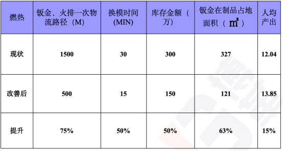 通過對配件車間內油壓機,火排沖壓設備,火排裝配線,水箱沖壓設備,小U開料設備,總裝車間備料區等設施進行重新規劃、調整,減少車間一次物流距離1500M,在制品面積下降63%,庫存金額下降50%。通過燃熱產品部物與情報現狀圖與理想圖對比,得出目前存在的問題并設置改善對策。