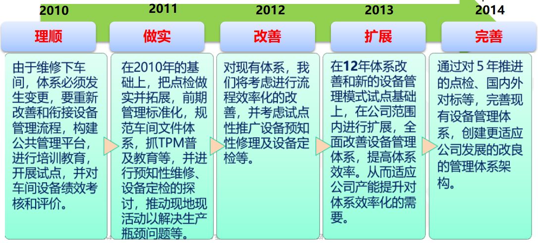 上海普華TPM圍繞著效率化維修戰略,本著循序漸進,一步一個腳印的原則進行五年規劃,按照2010年理順、2011年做實、2012年改善、2013年擴展、2014年完善的計劃進行輔導;