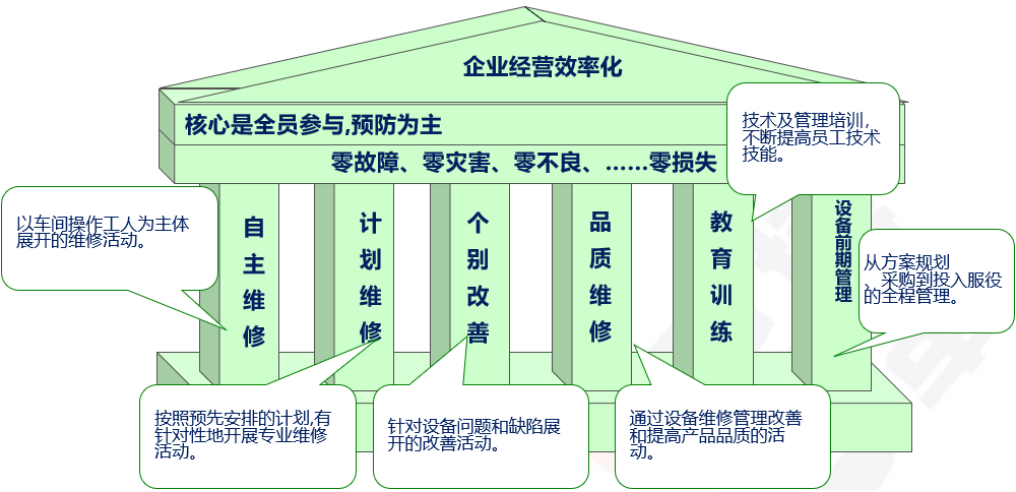 通過全員生產維護和持續改善,最大限度提高設備綜合效率、延長設備使用壽命為目標,使生產效益最大化,最終實現零缺陷、零故障、零災害、零不良、零損失 。