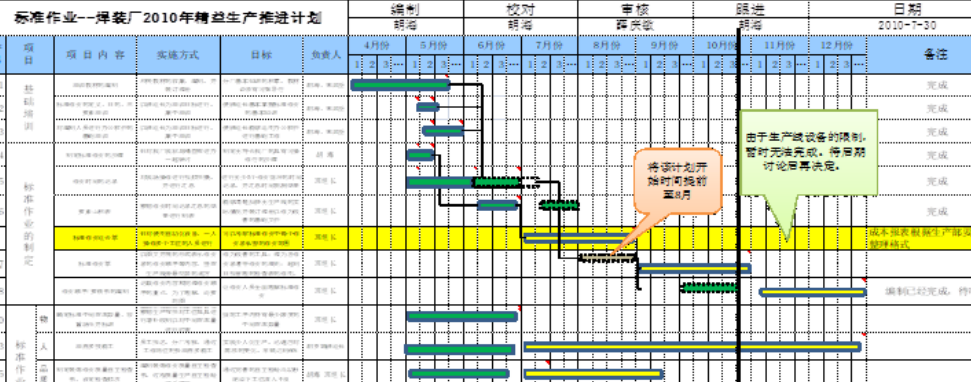 根據公司的經營目標及發展方向,提高廠能拉動生產已迫在眉睫;而要加快生產節拍必須先規范標準作業。標準作業是為了實現作業人員、作業順序、工序設備的布置、物流過程等的最優化組合設立的作業方法。為了實現以低廉的成本生產出優質產品的一個作業基準,項目組首先定年度推進計劃;