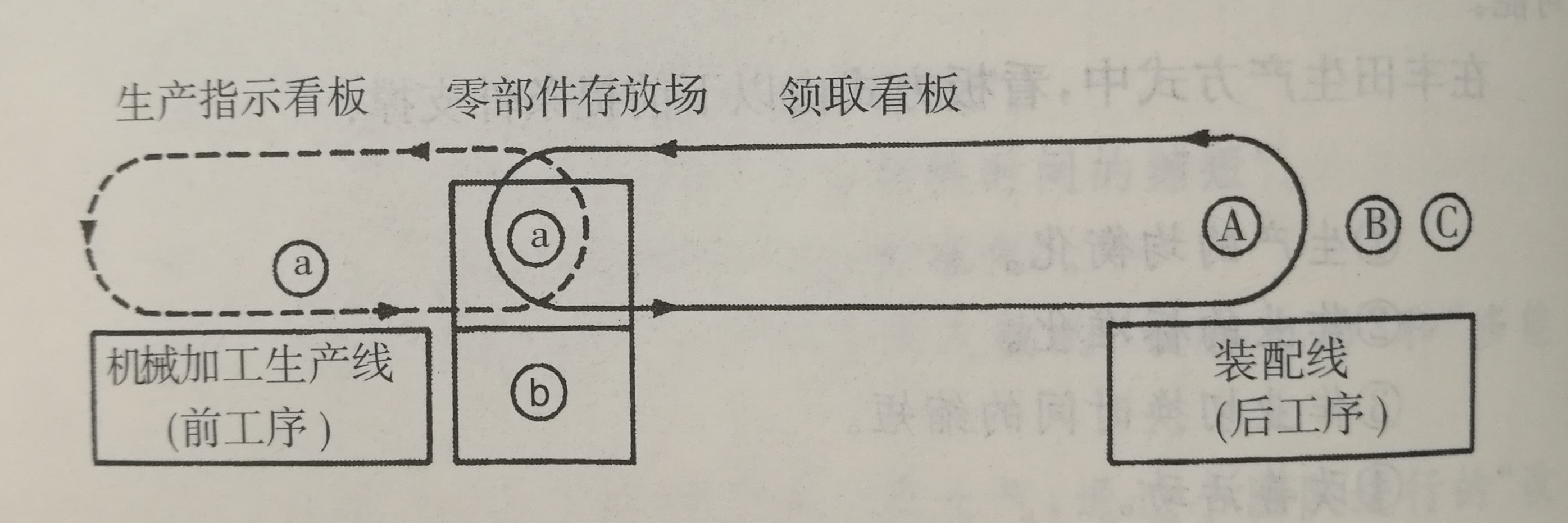 制造產(chǎn)品A的裝配線的搬運工為了領(lǐng)取必需的零件a,帶著空零件箱和領(lǐng)取看板來到機(jī)械加工生產(chǎn)線。然后,在零部件存放場a取出與領(lǐng)取看板相同數(shù)量的零件箱,并摘下掛在這些零件箱上的生產(chǎn)指示看板。接著把這些零件箱與領(lǐng)取看板一起帶回自己的裝配線,