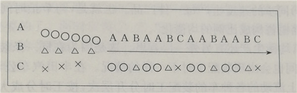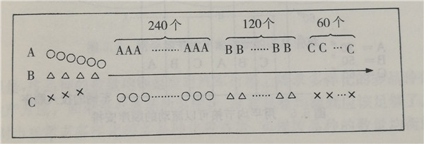 于是,如果用節拍時間制造所有的品種,每種產品都要用全部車種的平均節拍時間來制造,而每種產品的節拍時間在編排各種產品的順序時考慮就可以了。在豐田汽車公司為了均衡生產面編排的順序,就像圖1那樣。