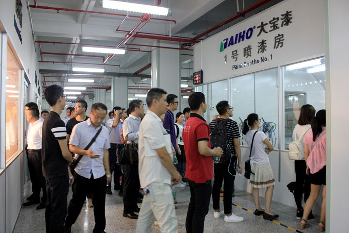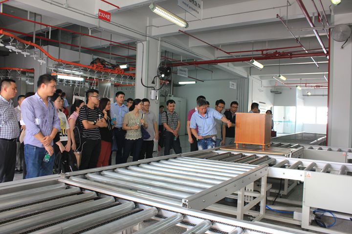 會后,在大寶化工平義聰課長的全程陪同下,索菲亞參訪人員一行先后到東莞大寶化工色板中心、中央實驗室、后花園、污水處理中心、智能涂裝測試線等進行參觀。技術(shù)人員為到訪人員講解廠區(qū)各區(qū)域規(guī)劃性能,在參觀色板中心時,索菲亞同仁們對大寶漆色板表現(xiàn)出極大的興趣,不斷與大寶漆工作人員交流探討心中疑問。