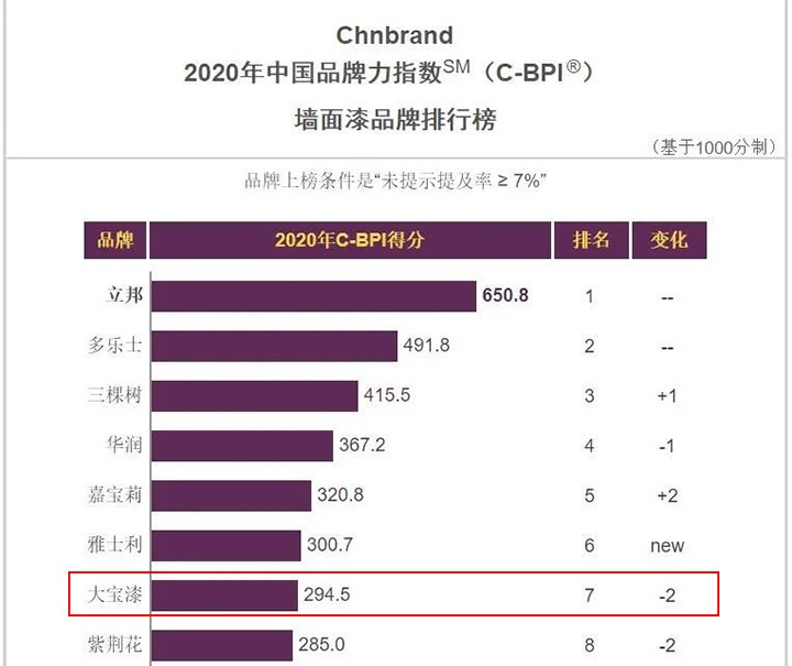 4月22日,中國(guó)領(lǐng)先的品牌評(píng)級(jí)權(quán)威機(jī)構(gòu)Chnbrand通過(guò)官網(wǎng)發(fā)布了2020年(第十屆)中國(guó)品牌力指數(shù)(C-BPI)品牌排名和分析報(bào)告。在激烈的品牌力競(jìng)爭(zhēng)中,大寶漆脫穎而出,再一次登上墻面漆、木器漆兩大品牌力指數(shù)排行榜單。