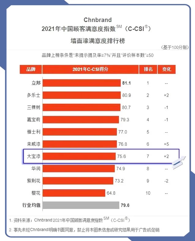 7月20日,品牌評級權威機構Chnbrand發布2021年度(第七屆)中國顧客滿意度指數(C-CSI)品牌排名及分析報告。大寶墻面漆與木器漆分別以第七、第九的優異排名入圍榜單,其中墻面漆較去年排名上升了2位,木器漆較去年上升了1位。