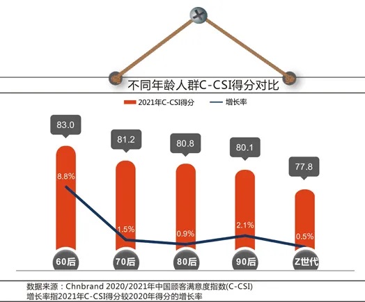 2021年C-CSI研究成果發現,在不同的人群前面,不同的顧客滿意度表現出明顯差異,60后的滿意度增長最快,而Z世代的滿意度則持續處于較低水平。人群在滿意度的差異表現也預示著企業對于用戶的精細化的管理時代的到來。