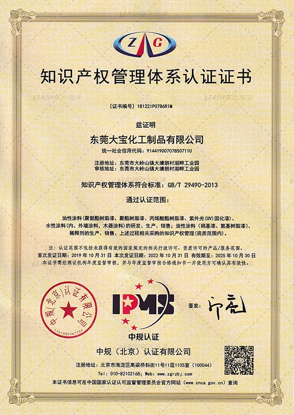 4月26日,是第23個世界知識產權日,大寶化工再次通過國家企業知識產權管理認證,是對大寶化工近年來取得創新成果的肯定,同時也標志著大寶漆在知識產權創造、運用、管理和保護方面具備領先水平。