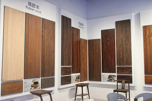 其展示精致與美學(xué)共存的色板,以黑檀、烏金木、白蠟?zāi)尽⒑诤液蛫W古曼等為代表的多種素材,呈現(xiàn)了色彩多樣化,工藝環(huán)保化趨勢,滿足了用戶對于不同風(fēng)格的需求。
