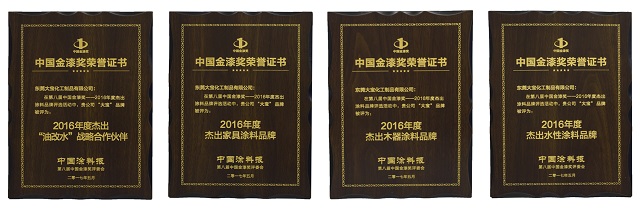 會(huì)議頒發(fā)了在多個(gè)細(xì)分渠道領(lǐng)域的2016年度杰出涂料品牌,大寶漆憑借其臻于至善的品質(zhì)及消費(fèi)者的支持,榮膺2016年度杰出“油改水”戰(zhàn)略合作伙伴、杰出木器裝修涂料品牌、杰出家具涂料品牌、杰出水性涂料品牌等4項(xiàng)大獎(jiǎng)。同時(shí),大寶漆經(jīng)銷(xiāo)商杭州啟納實(shí)業(yè)有限公司獲得了2016年度杰出家具涂料經(jīng)銷(xiāo)商獎(jiǎng)項(xiàng)。大寶漆獨(dú)攬5個(gè)獎(jiǎng)項(xiàng),收獲頗豐。
