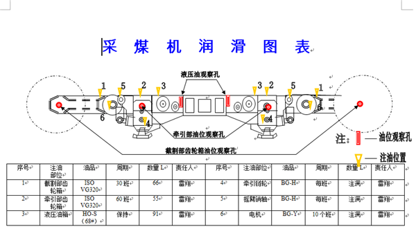 2016年5月份,從綜采隊試點梳理設備潤滑維護標準可視化基礎提升管理方法,結合現有設備圖冊、潤滑標準、TPM可視化相關要求制作綜合看板,摒棄了以前的文字描述、該方式圖文并茂,有利于相關人員的掌握,現已在22204-1面開始實施
