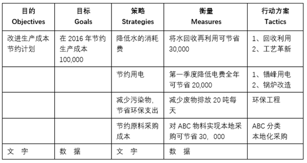 2015年6月份,機電辦精益化管理組編制下發OGSM目的、目標、策略、衡量、行動方案)分解策略執行法試行推廣,該方法旨在理清管理人員系統的想法、精確地分析問題、看到核心問題的所在,最后制定清晰的目的及目標。在梳理目標任務的同時,將行動方案一并進行落實